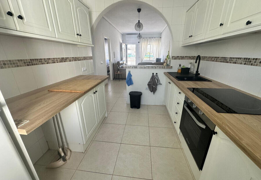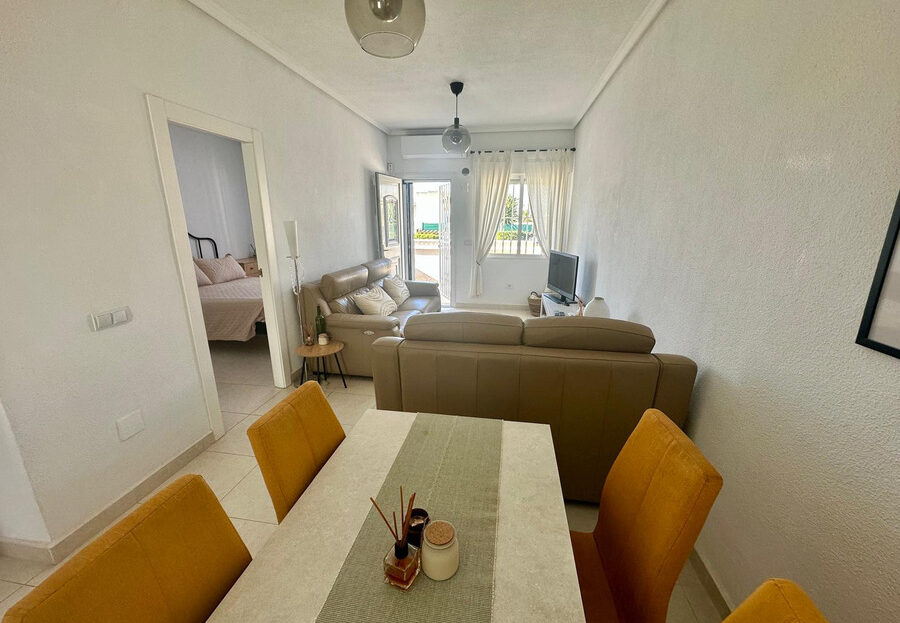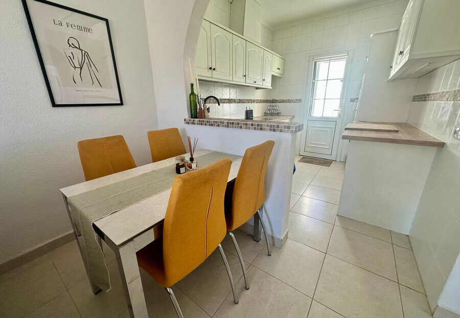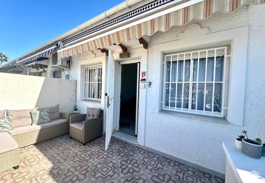 We are pleased to offer this well presented single storey bungalow situated on a quiet gated community in the sought after area of Pueblo Bravo, Ciudad Quesada.This south facing well appointed property offers a split level front terrace with useful storage areas located under the large sun terrace providing a lovely area from which to enjoy the afternoon and evening sun.From the terrace we enter a comfortable, bright living room with dining area leading to an open plan good size fully fitted modern kitchen.The kitchen provides back door access to the rear terrace and seating area, an ideal location for morning coffee in the sun or taking advantage of some well needed afternoon shade during peak summer time. The rear terrace provides access to the utility area and further storage.The property enjoys two good size double bedrooms both with double fitted wardrobes which share a modern up to date bathroom with shower.The community benefits from two separate gated entrances with internal parking providing good security for residents only.The property provides hot and cold air conditioning and is sold with the furnishings. Bars and restaurants within a 5 minute walk. Short drive to supermarkets, shops, full amenities and the beautiful beaches of Guardamar del Segura and La Mata.