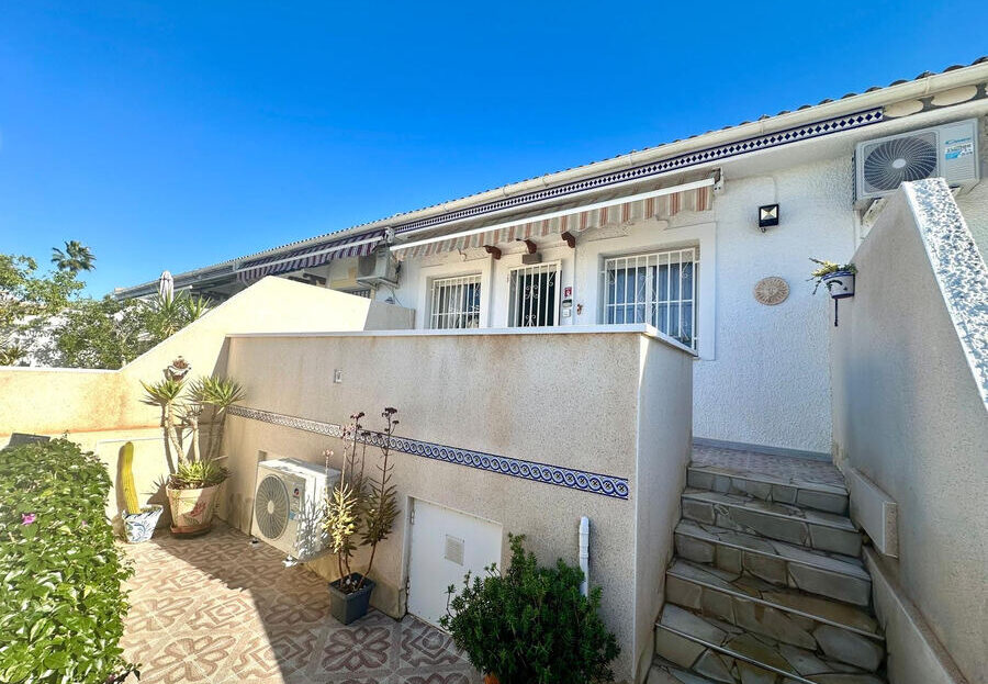 We are pleased to offer this well presented single storey bungalow situated on a quiet gated community in the sought after area of Pueblo Bravo, Ciudad Quesada.This south facing well appointed property offers a split level front terrace with useful storage areas located under the large sun terrace providing a lovely area from which to enjoy the afternoon and evening sun.From the terrace we enter a comfortable, bright living room with dining area leading to an open plan good size fully fitted modern kitchen.The kitchen provides back door access to the rear terrace and seating area, an ideal location for morning coffee in the sun or taking advantage of some well needed afternoon shade during peak summer time. The rear terrace provides access to the utility area and further storage.The property enjoys two good size double bedrooms both with double fitted wardrobes which share a modern up to date bathroom with shower.The community benefits from two separate gated entrances with internal parking providing good security for residents only.The property provides hot and cold air conditioning and is sold with the furnishings. Bars and restaurants within a 5 minute walk. Short drive to supermarkets, shops, full amenities and the beautiful beaches of Guardamar del Segura and La Mata.