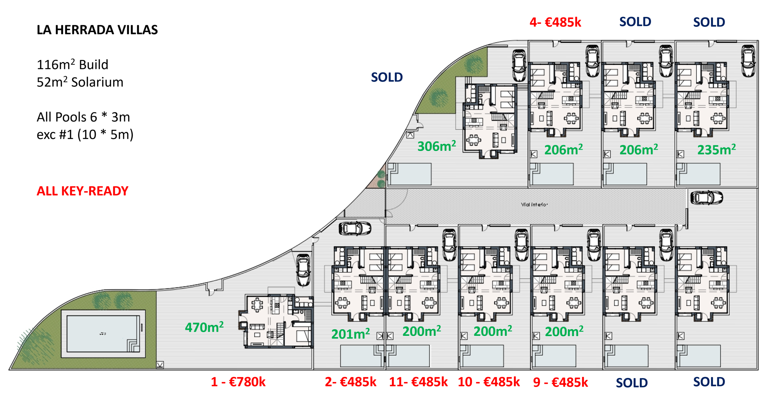 All are on similar-sized plots, except for the prestigious #1, which sits on a 470m2 plot with a 10m pool & two extra bedrooms in an under-build to make five!