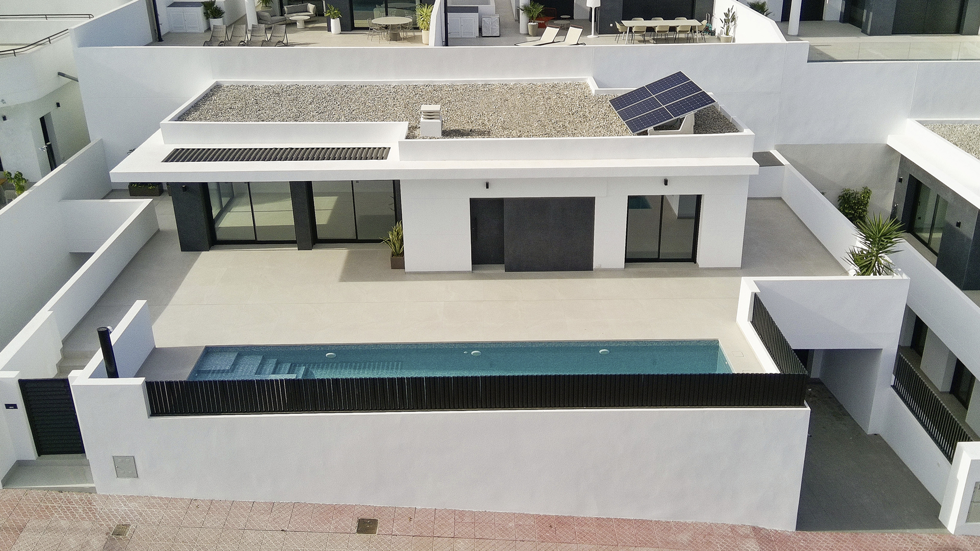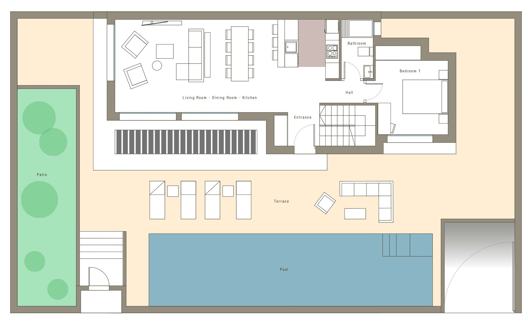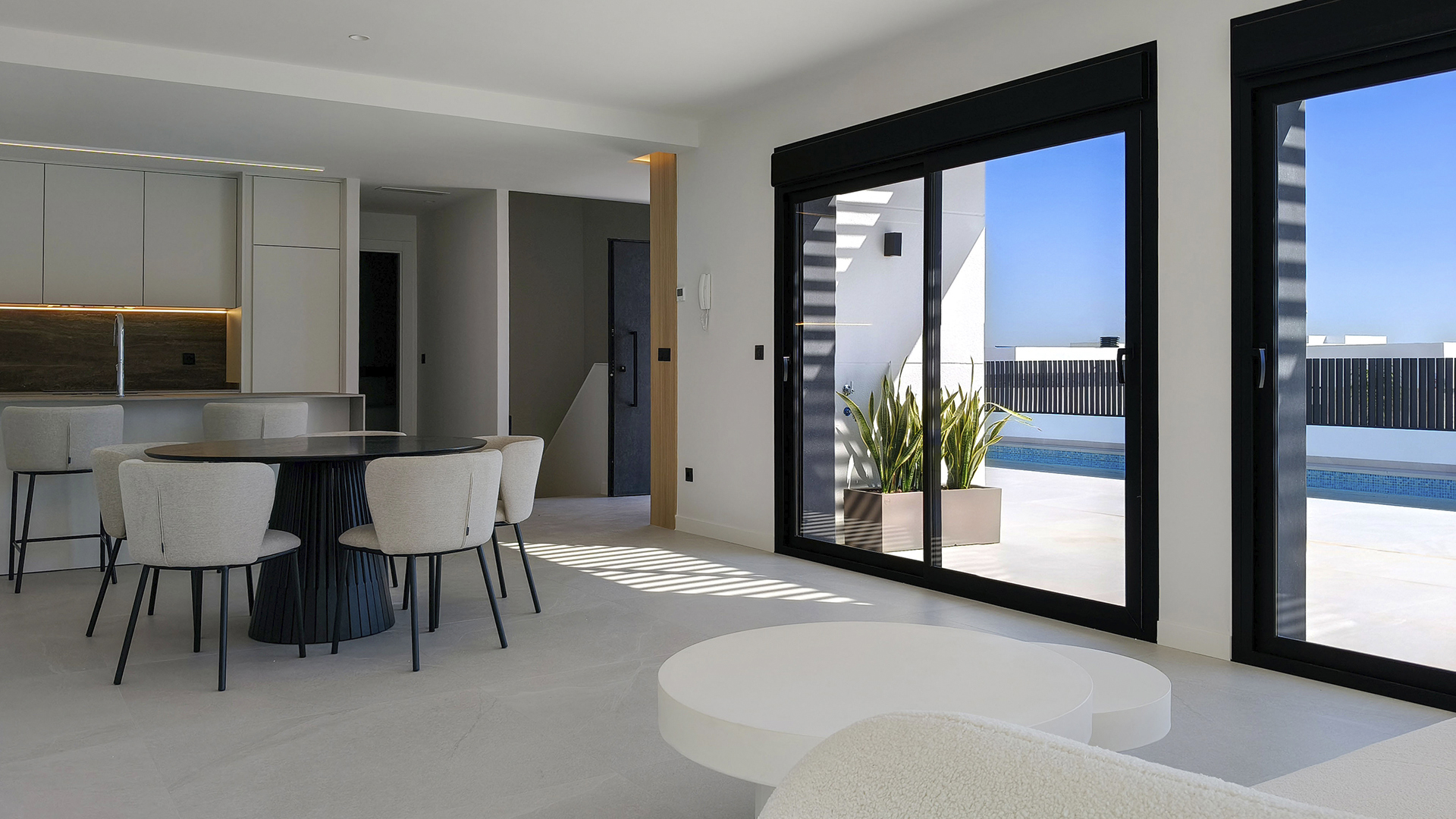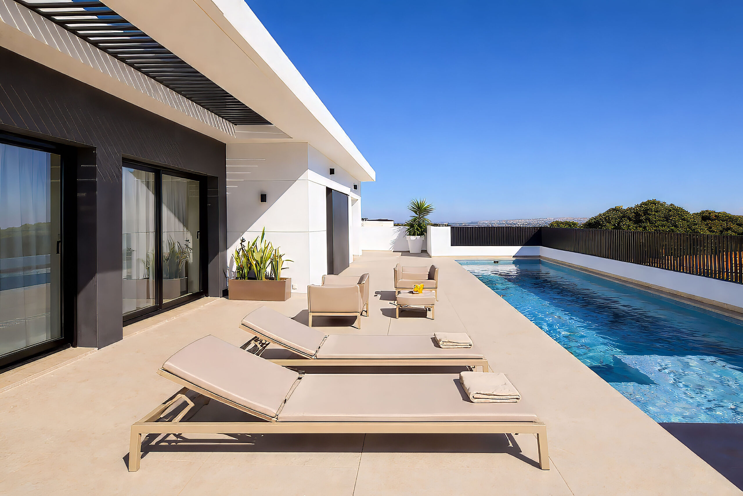 The light-filled living room and kitchen layout merges with the amazing outdoor terrace and large pool. The bedrooms are located in the cozy under build together with a secondentertainment room that can be turned into an additional bedroom.