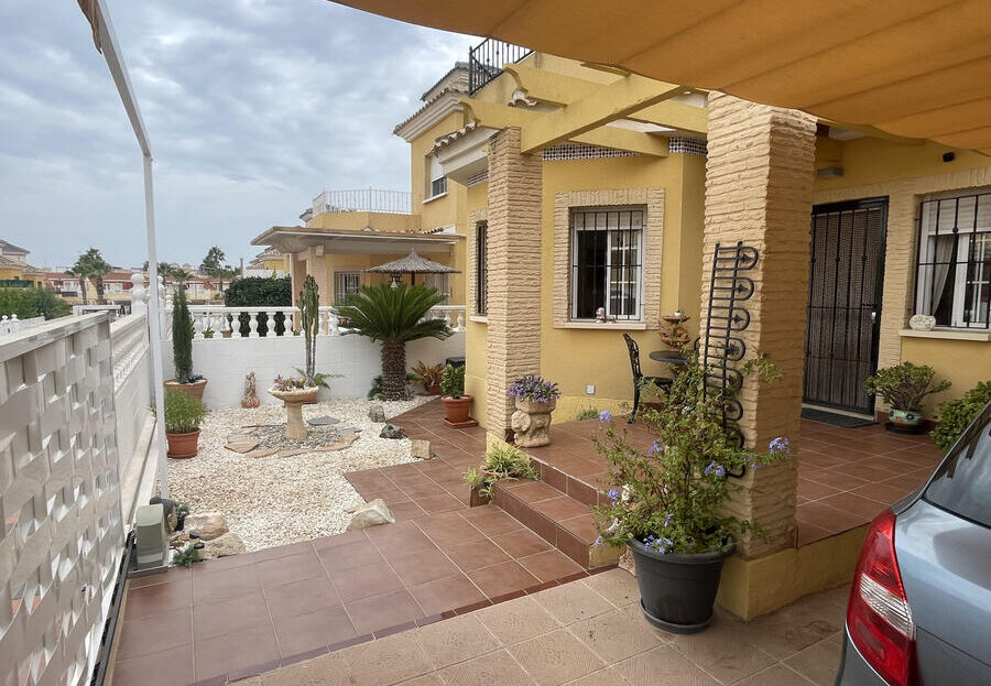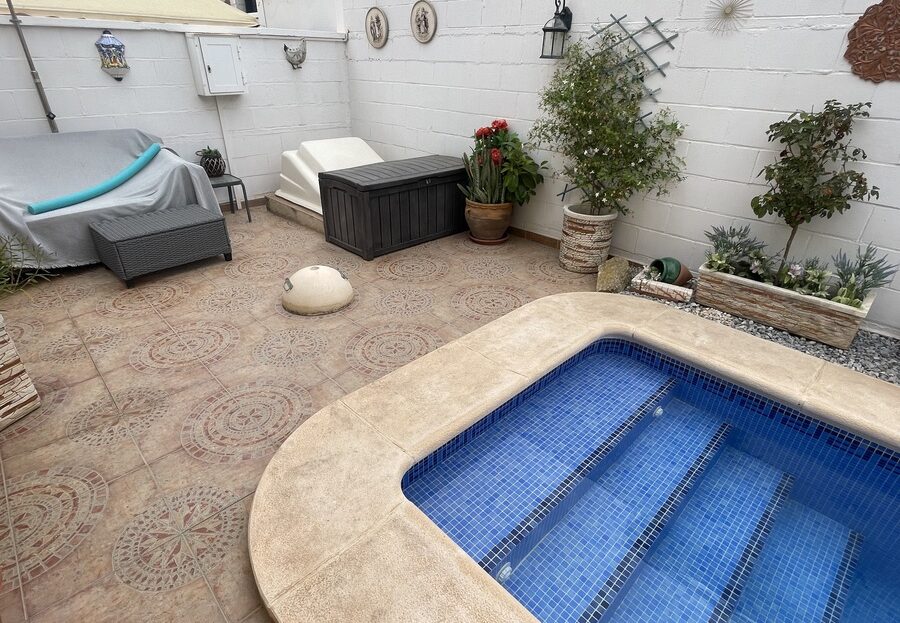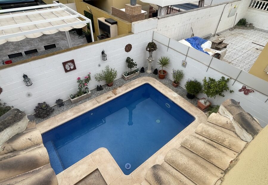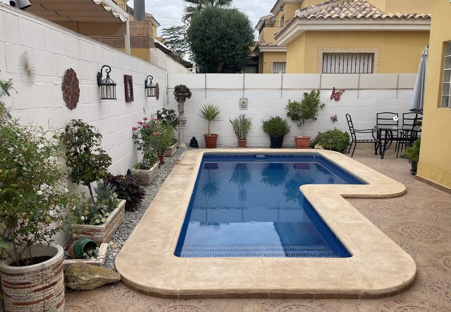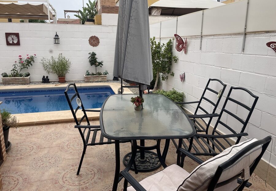Beautifully Designed Villa in Lo Crispín, AlgorfaLocated in the popular residential area of Lo Crispín, Algorfa, this well-laid-out villa offers a comfortable and stylish living experience in the heart of the Costa Blanca.The property features two bedrooms and two bathrooms, with one bedroom and bathroom conveniently located on the ground floor, and the second bedroom and bathroom situated upstairs for added privacy.This charming villa includes a private swimming pool, a solarium, and a balcony. The outdoor space is easy to maintain and beautifully landscaped with a variety of vibrant plants and flowers, creating a peaceful and inviting atmosphere.Both the kitchen and living room offer direct access to the patio, allowing natural light to flood the interior and giving the home a bright, airy feel. The open layout enhances the sense of space and connection between indoor and outdoor living.The wood burner stove adds character and a bonus in the short winter months.Whether you are looking for a permanent residence, a holiday home, or a rental investment, this villa combines comfort, convenience, and Mediterranean charm in one of the region’s most desirable communities.